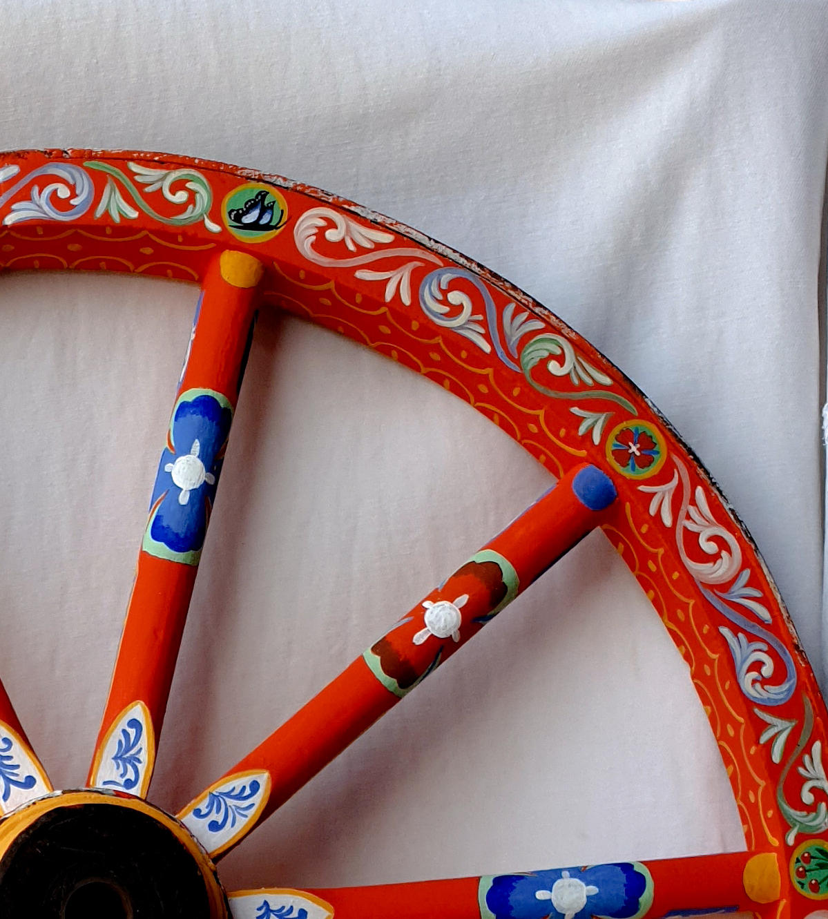 Ruota in legno antica recuperata e trattata e infine dipinta ad acrilico secondo le decorazioni della pittura del carretto catanese