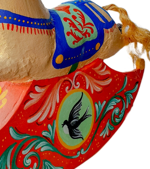 Cavallino a dondolo con anima di legno e rivestito con cartone, stucco e cartapesta.