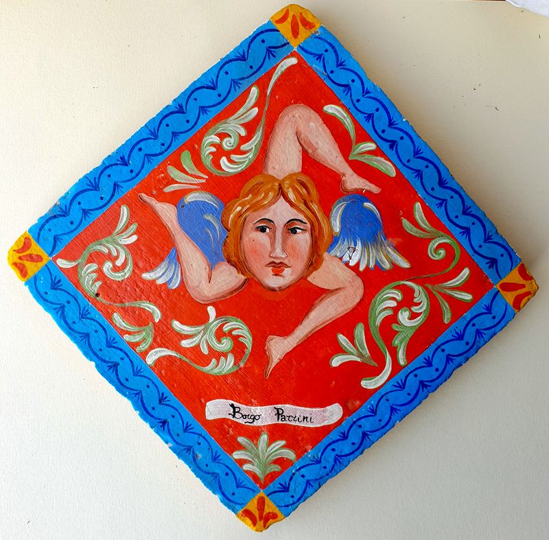 Mattonella in terracotta dipinta a freddo coi colori acrilici e olii riportante al centro la trinacria e ai bordi le decorazioni tipiche del carretto di stile catanese.